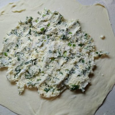 Отдохнувшее тесто поделить на 6 частей. Одну часть берём и тонко раскатываем, присыпая постоянно стол мукой. Далее выкладываем начинку по центру раскатанного круга вот так.