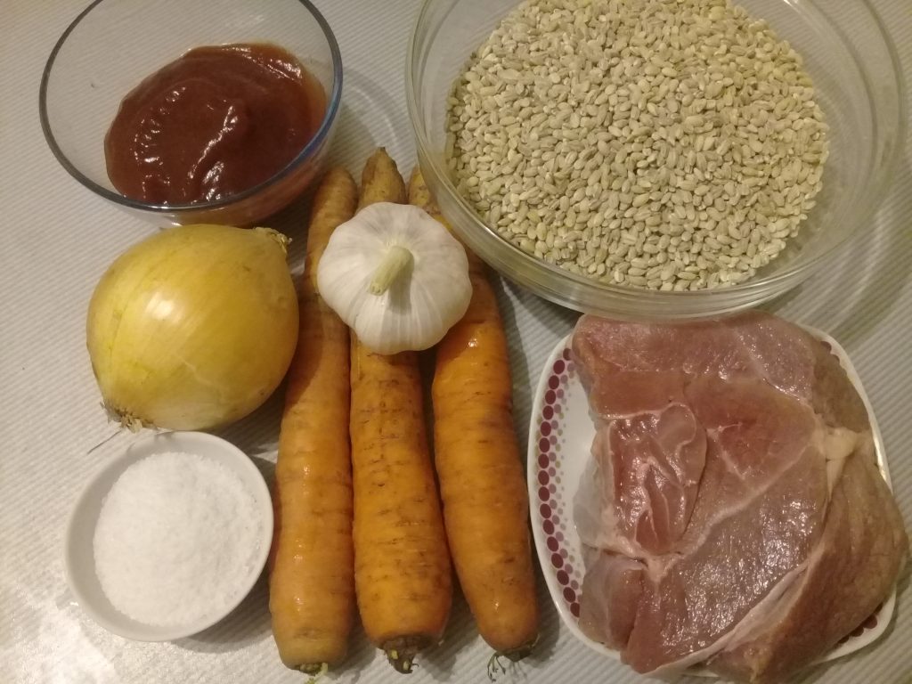 Шаг 11. Подготавливаем ингредиенты: мясо необходимо разморозить, хорошо вымыть, обсушить, лук и морковку почистить, перловую крупу промыть.