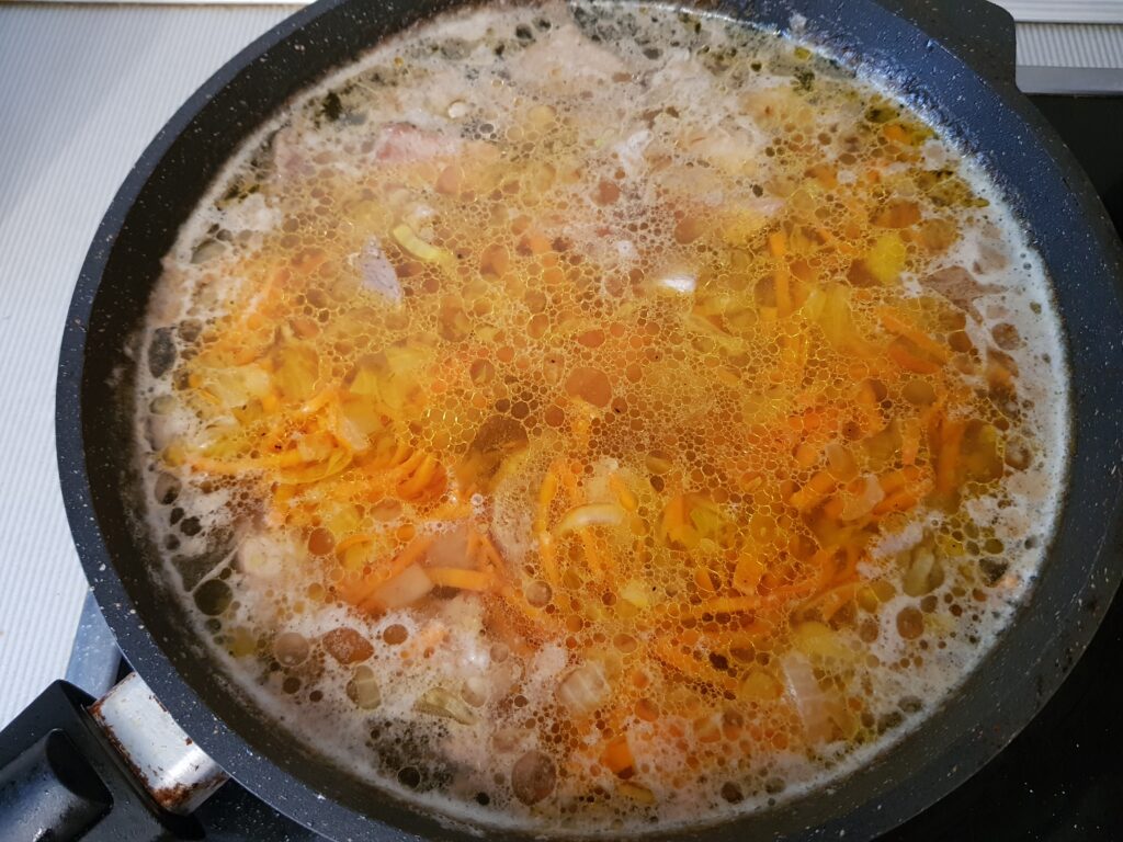 В это время подготовить овощи: лук и морковь очистить от кожуры и промыть под проточной водой. Лук нарезать небольшим кубиком. Морковь нарезать соломкой.