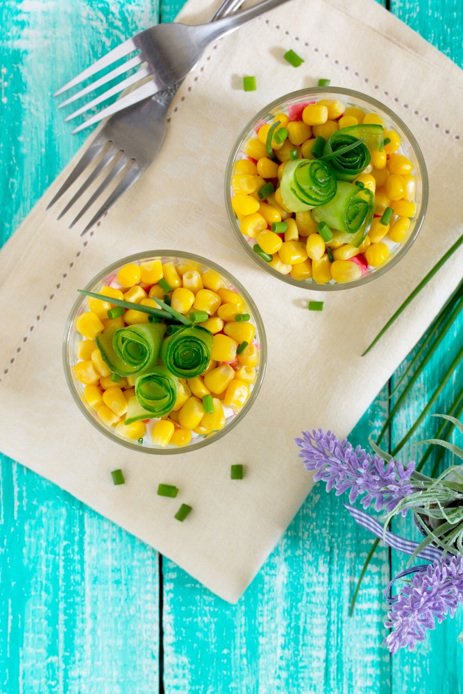 Первым слоем выкладываем крабовые палочки, немного солим, затем отправляем кукурузу, следующий слой это огурцы, немного солим, дальше отправляем яйца. И снова выкладываем крабовые палочки, немного солим, завершающий слой у нас кукуруза. Кое-где можно между слоев присыпать зеленым лучком.
