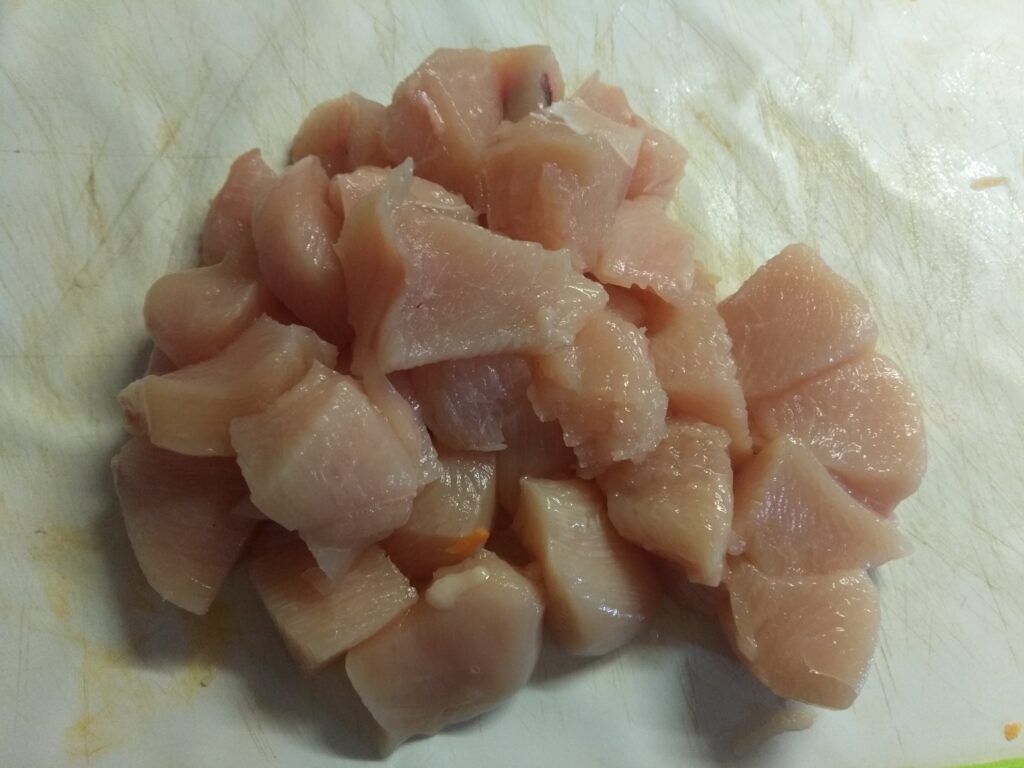 3. Куриное филе нарезать небольшими кусками. Добавить к луку и моркови. Также слегка обжарить.