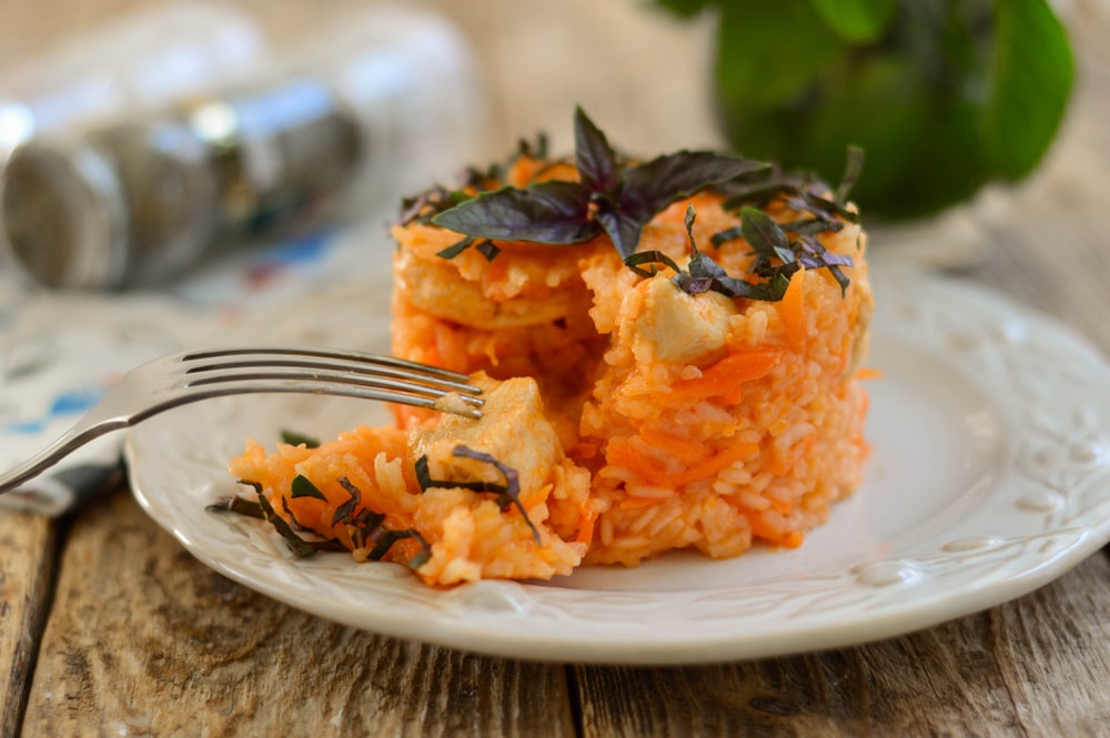 Берем круглую форму для приготовления салата, размещаем в центре тарелки и заполняем рисом с курицей. Ложкой уплотняем. Снимаем кольцо. Украшаем зеленью. Приятного аппетита!