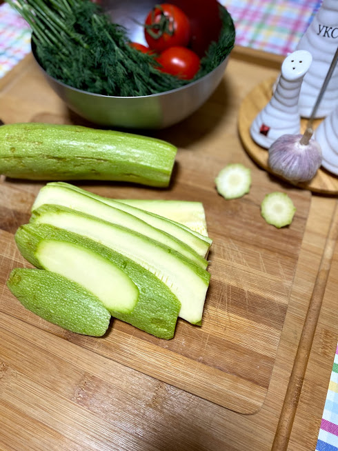 Кабачки помоем под проточной водой, обрежем у них кончики, нарежем вдоль тонкими ломтями.