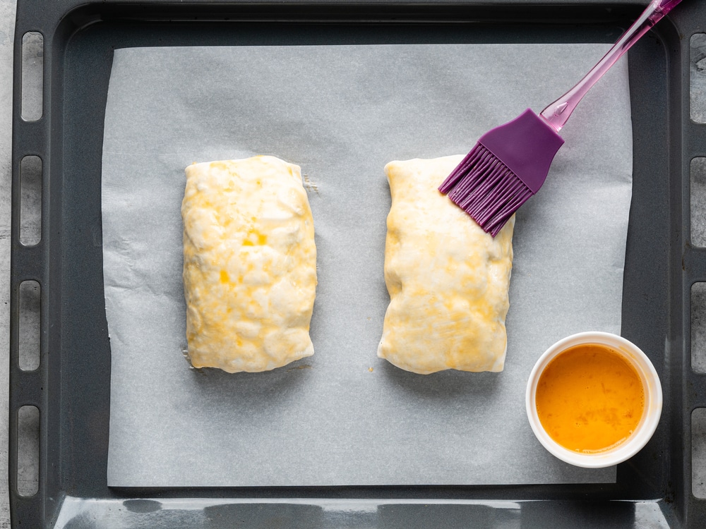 Заворачиваем концы теста, чтобы получился пирог. Кстати, можно использовать и несколько другую технологию - выложить начинку и накрыть вторым пластом теста, защипнуть края. Повторим процесс со вторым куском теста, если вы готовили 1 вариант.