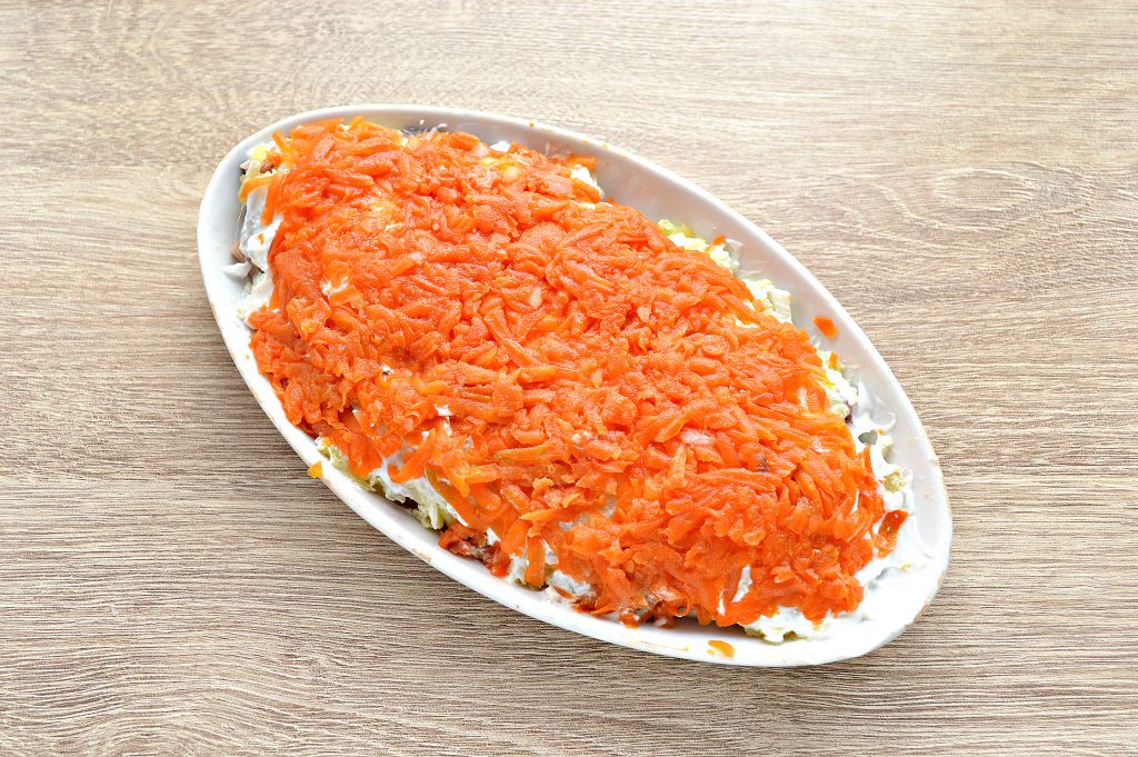 Теперь последует морковный слой. Морковку тоже измельчаем на терке. Этот слой не забываем смазать майонезом тоже.