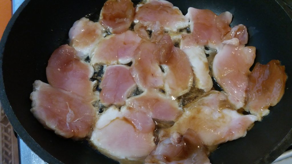 Шаг 1Подмороженное филе режем тонкими пластинками, маринуем соевым соусом, оставляем на час (можно дольше).