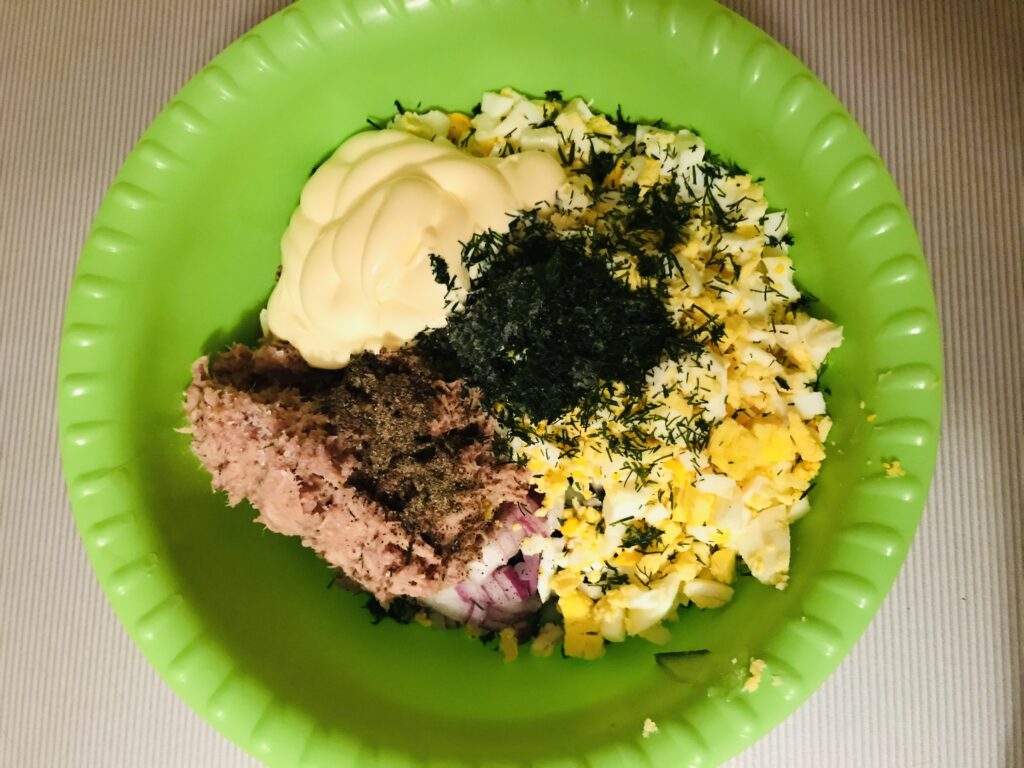 В самом конце выкладываем тунец, соль, перец, майонез и укроп. Если тунец целым куском, то необходимо растолочь его вилкой. У меня был уже готовый «салатный».