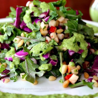 4. В чашу с капустой перекладывают вяленые томаты, яблоки. В салат добавляют пряности, соль, перец, можно добавить зелени. Заправить салат оливковым маслом и перемешать.