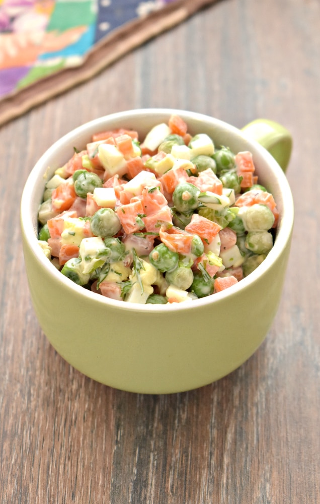 В составе салата — самые простые и доступные ингредиенты, но получается он очень вкусным и сочным. Заранее для салата нужно отварить морковь и яйца. О том, как подготовить свежий замороженный горошек, расскажу в этом рецепте.