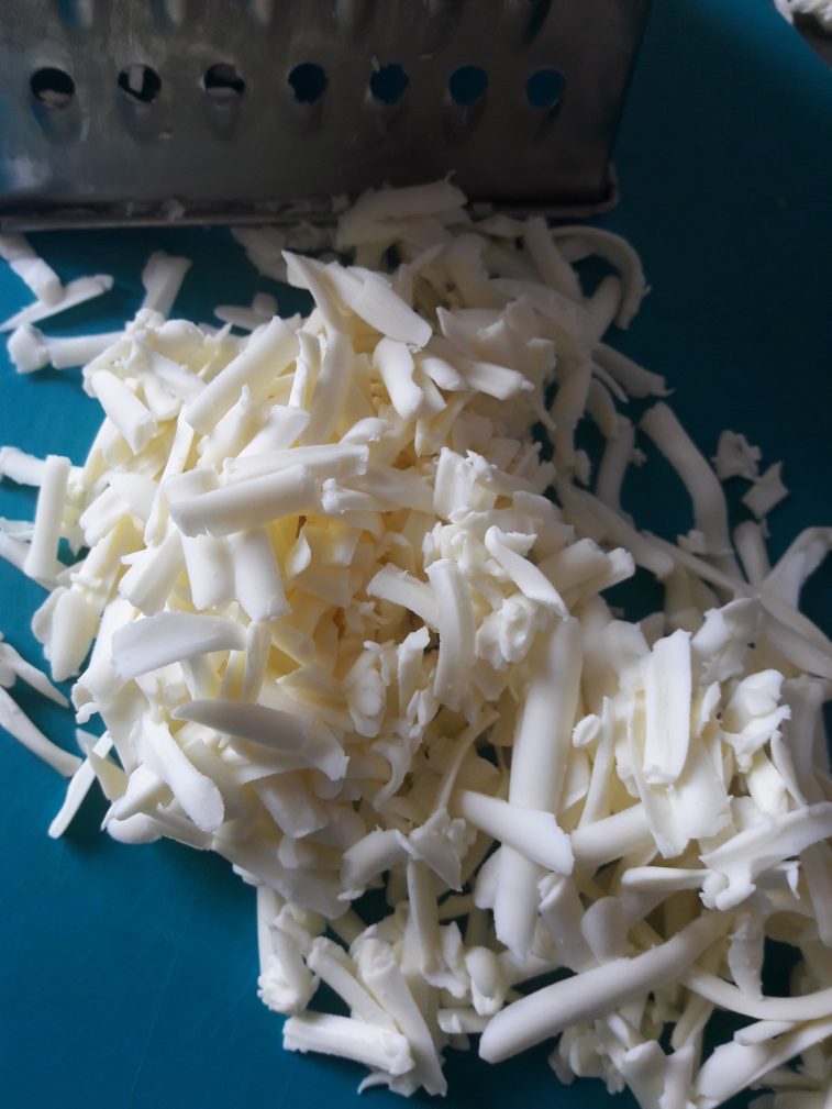 Остывшие яйца очистить и натереть на крупной терке. Я тру на терке для скорости, можно нарезать кубиками или пропустить через яйцерезку.