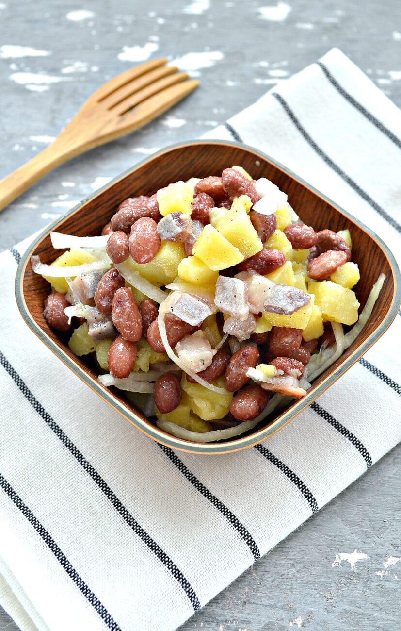 Можно сразу подавать такой салат с картофелем, фасолью и сельдью к столу. Приятного перекуса!