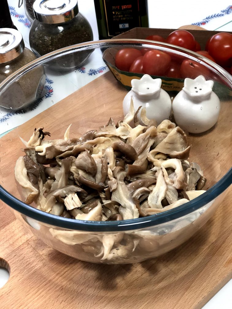 Разделанные грибы польем соусом терияки и присолим. Отставим миску в сторону, чтобы они пропитались.