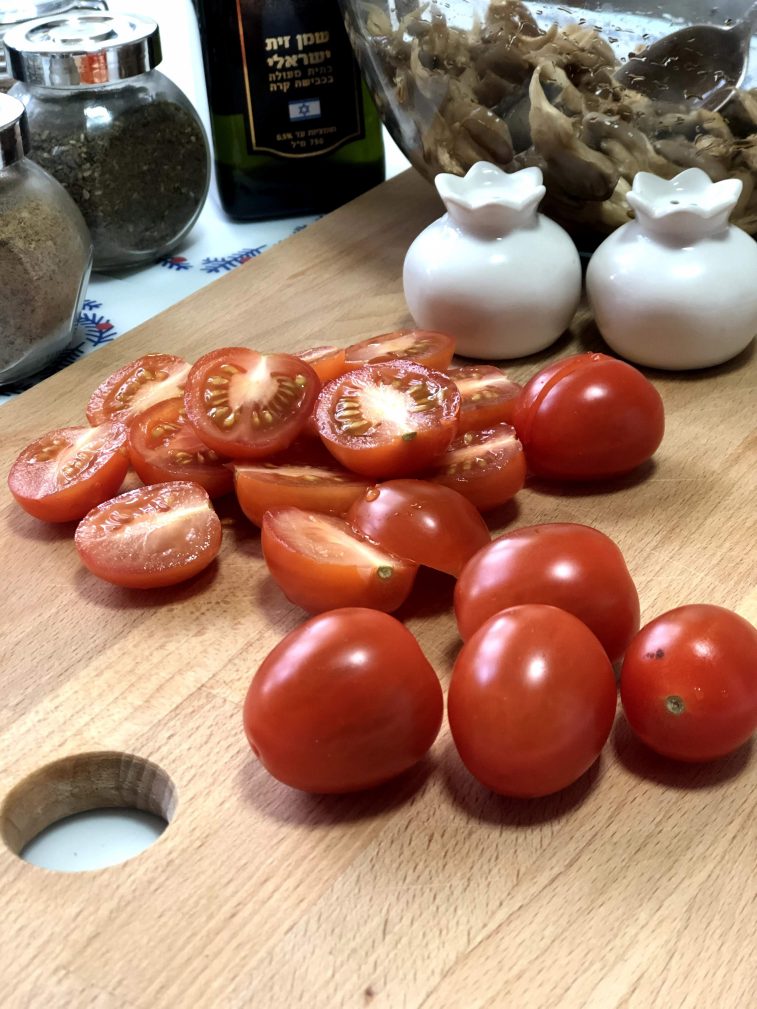 Томаты черри помоем и нарежем на половинки.