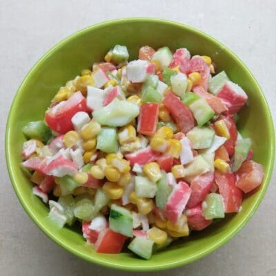 Крабовые палочки порезать кубиками среднего размера. Болгарский перец я режу чуть мельче, так он жестче.
