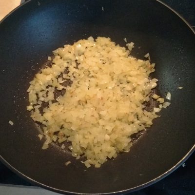 3. Лук помыть, очистить и мелко нарезать. Обжарить на растительном масле. Затем добавить ножки шампиньонов.