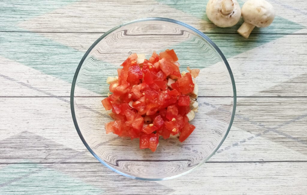 Начинка для фаршировки шампиньонов будет состоять из грибных ножек, помидоров и плавленного сыра. Ингредиенты измельчим, дополним свежей зеленью. Для запекания потребуется также твердый сыр. Кстати, для рецепта лучше взять крупные шампиньоны.