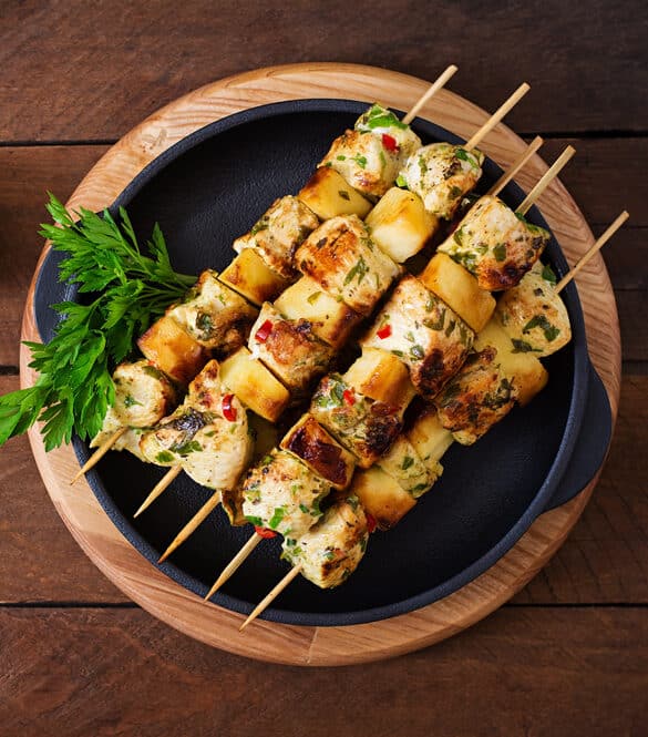 Мясо нанизываем на шпажки, чередуя с яблоками. Шашлыки укладываем на противень застеленный фольгой. Отправляем в разогретую духовку (180 С) на 20-25 минут.