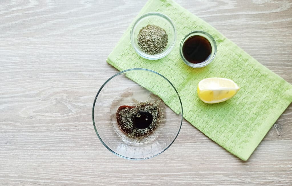 Шаг 1Для приготовления маринада в небольшую посудину наливаем две столовые ложки оливкового масла, добавляем к нему столовую ложку лимонного сока.