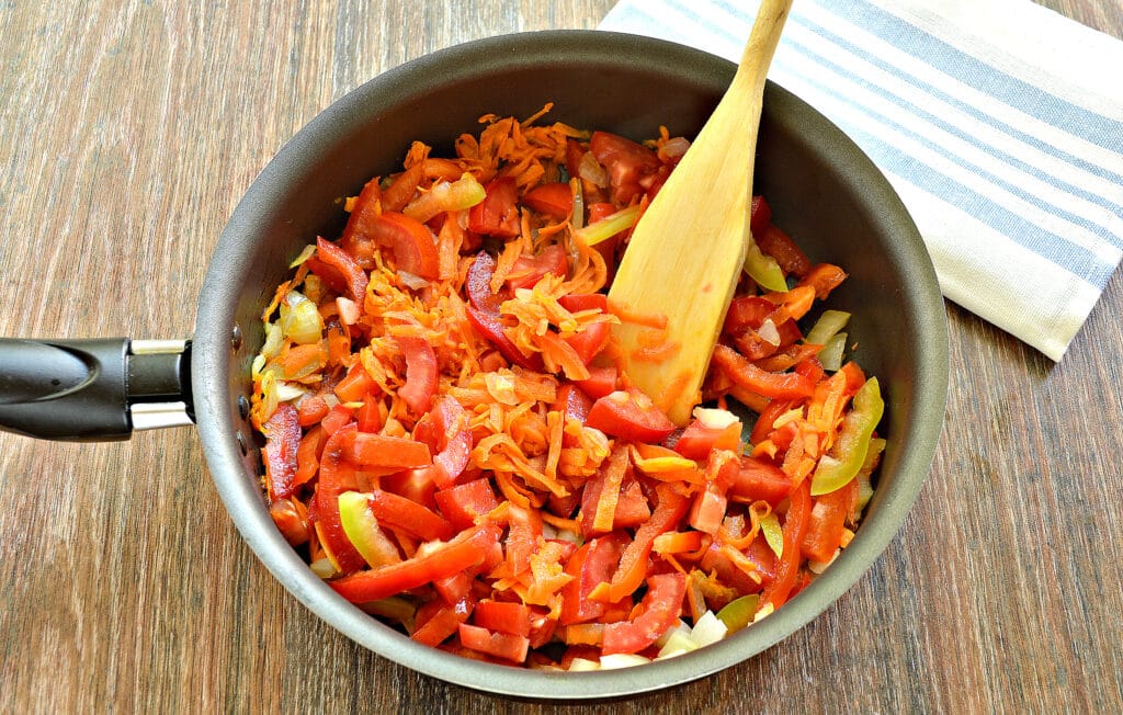 Совместно пассеруем на малом огне 15 минут, иногда перемешиваем. Затем овощи перекладываем в кастрюлю. Варим еще 20 минут.