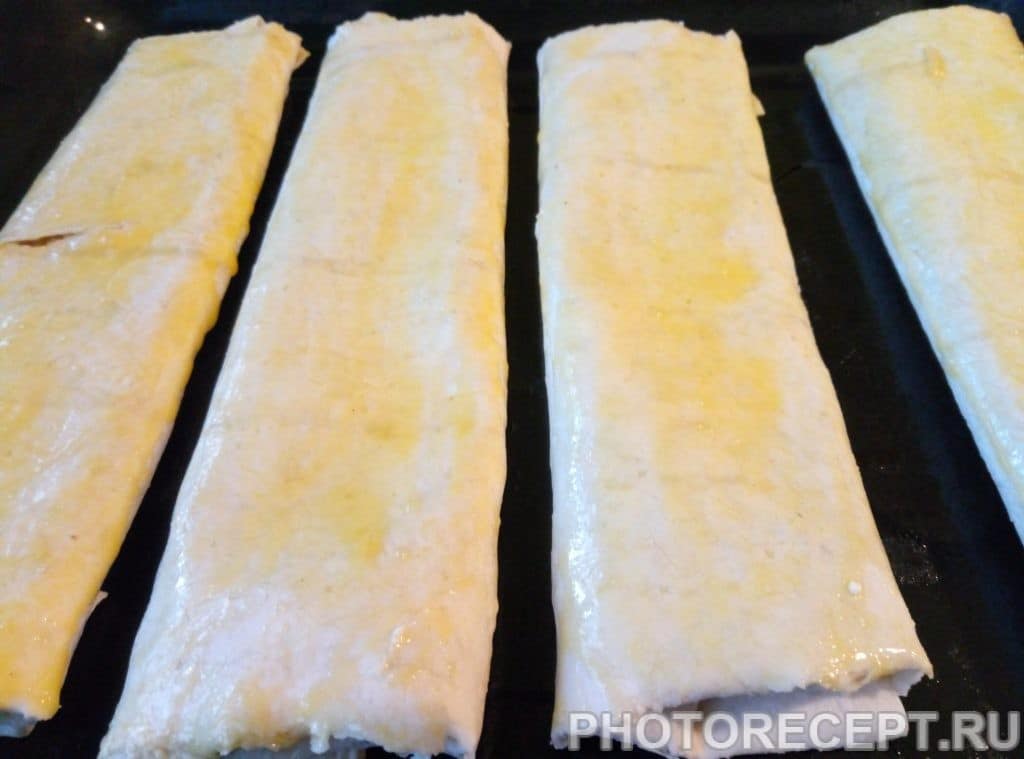 Заворачиваем в рулет, края лучше подвернуть. И выкладываем на смазанный противень