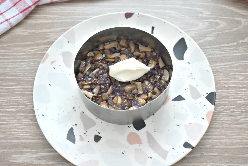 На слое из яиц размещаем обжаренные грибы. Грибной слой покрываем майонезом.