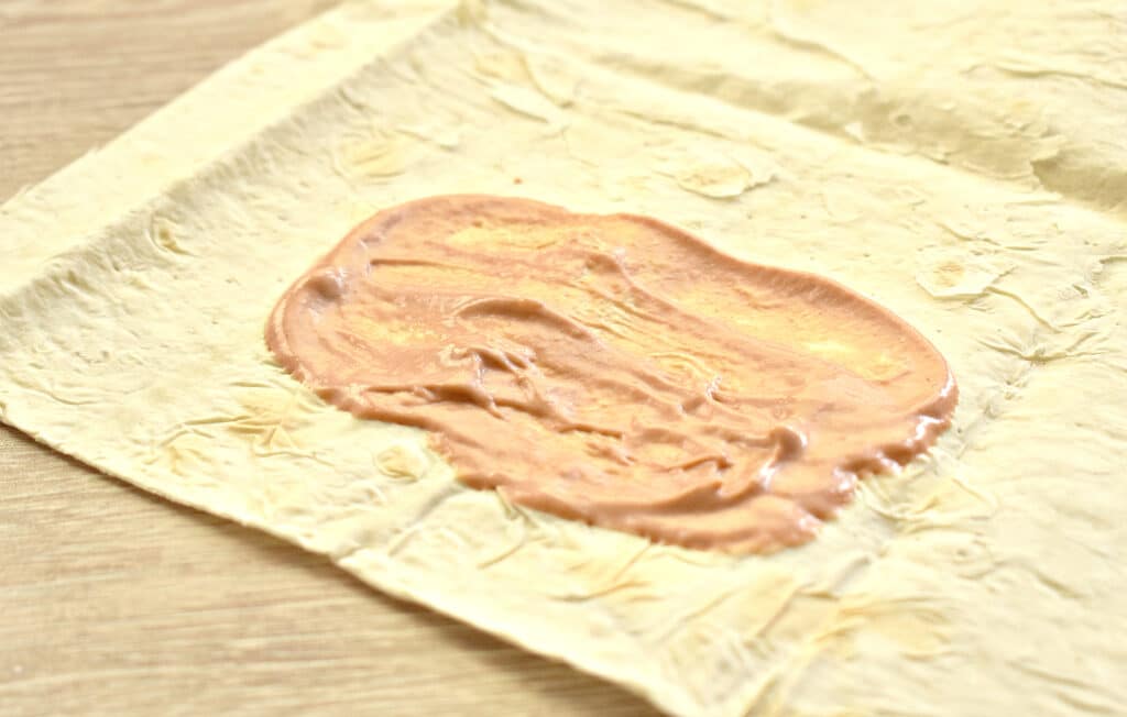 Шаг 1Тонкий свежий лаваш разрезаем на 2 равные части. Майонез смешиваем с томатной пастой и получаем соус, которым нужно смазать небольшую часть лаваша, отступив от краев примерно по 5 см.