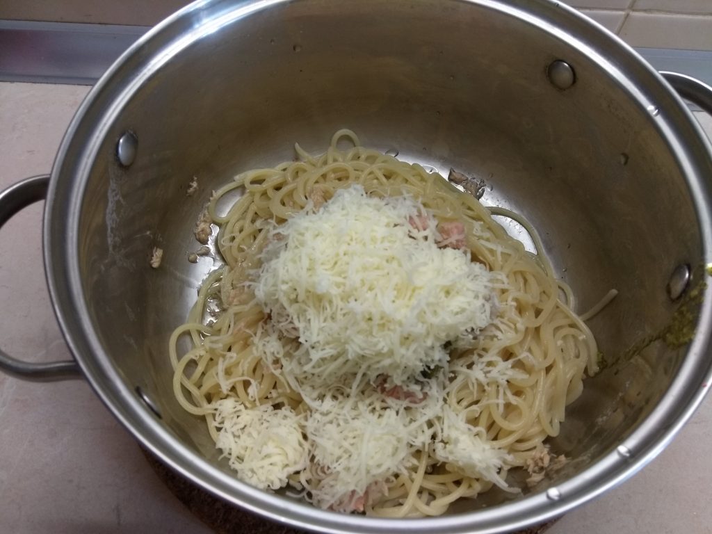 Сыр натереть на мелкой терке, так он лучше распределится в макаронах. Добавить тунец.
