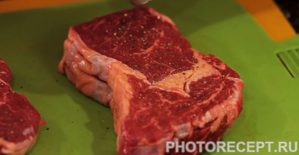 Шаг 11.Для начала нужно выбрать правильное мясо для стейка. Самое неприхотливое в приготовлении - рибай. Это подлопаточная часть туши. Толщина должна быть не менее 2 см! Лучше всего покупайте его в мясной лавке, а придя домой обязательно пощупайте, оно не должно липнуть к рукам и пахнуть аммиаком. Это говорит о том, что оно не свежее.