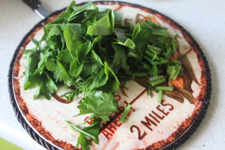 Измельчить шпинат, петрушку и зеленый лук по вкусу. Добавить ингредиенты в суп и снять блюдо с огня.