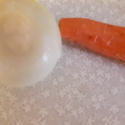 Пока варится бульон, нужно приготовить зажарку. Для этого лук и морковь почистить, лук нарезать, морковь натереть на крупной тёрке и отправить всё обжариваться на растительном масле в течение 5 минут.