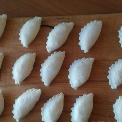 Складываем вареники на разделочную доску или плоскую тарелку, присыпанную мукой. Ставим кастрюлю с водой на огонь. Как закипит, добавляем соль. Вари минут 10-15.