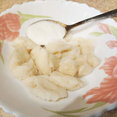 Готовые вареники выкладываем на тарелку, поливаем сметаной, подаем.
