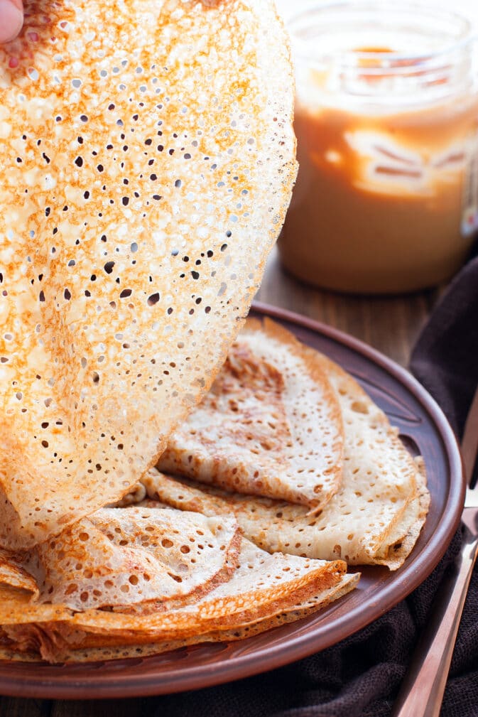 На сковородку наливаем масло и ждем, пока дно нагреется. На раскаленную сковородку льём немного теста, даем растечься, наклоняя посуду в разные стороны и жарим по красивого румяного цвета минут 3-5 с одной и другой стороны. Наши ажурные блинчики с дырочками готовы, приятного аппетита!