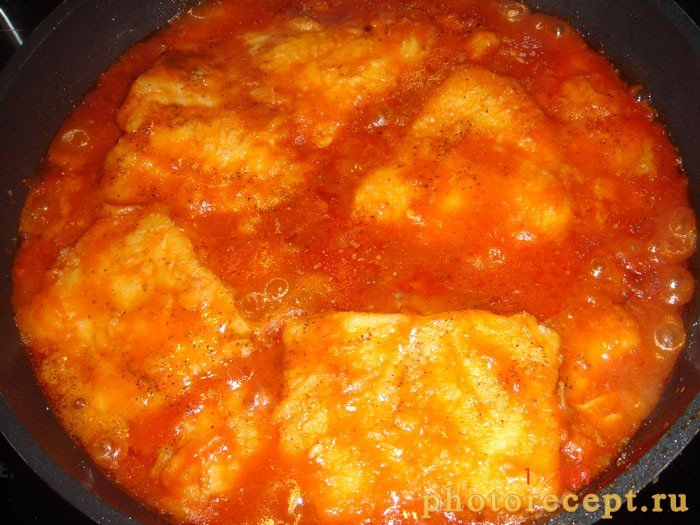Сковороду накрыть крышкой и в течение 15-20 минут тушить на небольшом огне. Огонь должен быть слабый, чтобы структура рыбы сохранилась в первозданном виде. Тушеная рыба в томате готова. Дайте ей немного отстояться, и приятного аппетита!