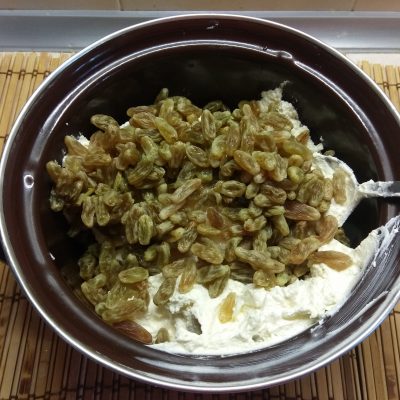 3. Добавить сахар. Слить воду с изюма и также добавить к творожной массе.