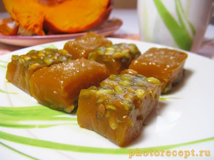 Готовую сливочно-тыквенную смесь вылить в форму. Дать застыть в холодильнике. При желании посыпать сверху крупной солью. Горячим ножом нарезать на квадратики и подавать, как конфеты с чаем.