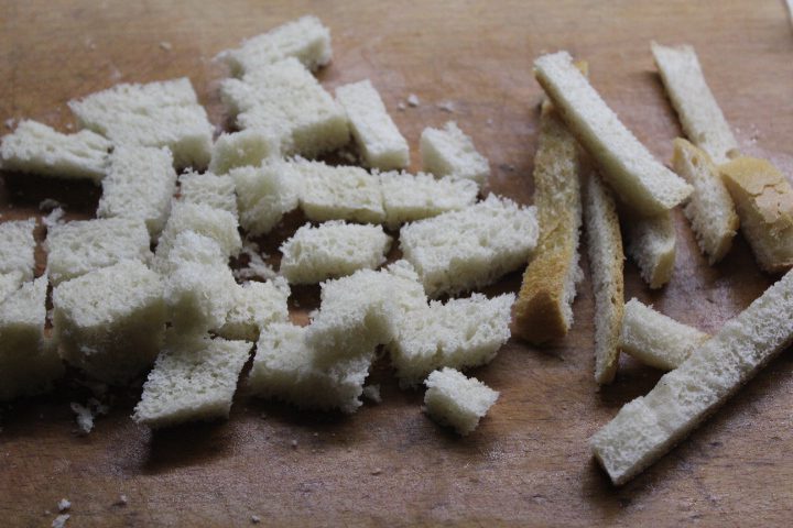 Обрежьте корочки с кусочков хлеба, если любите твердые поджаристые сухарики, не срезайте. Нарубите мякиш хлеба кубиками.