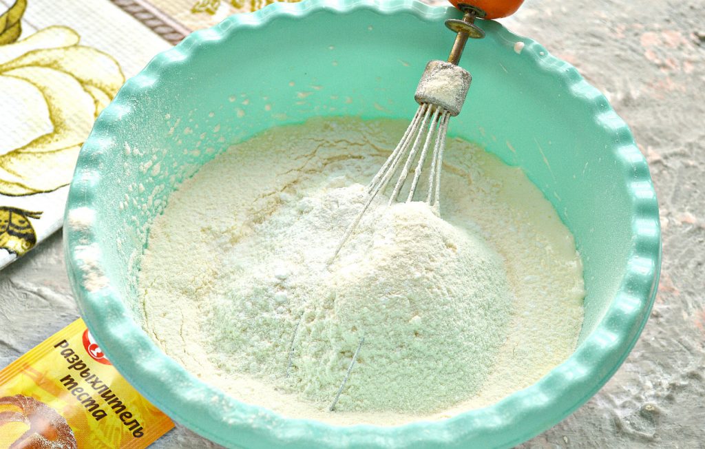 В миску просеиваем муку. Вместе с мукой добавляем разрыхлитель для теста и соль в указанных количествах.
