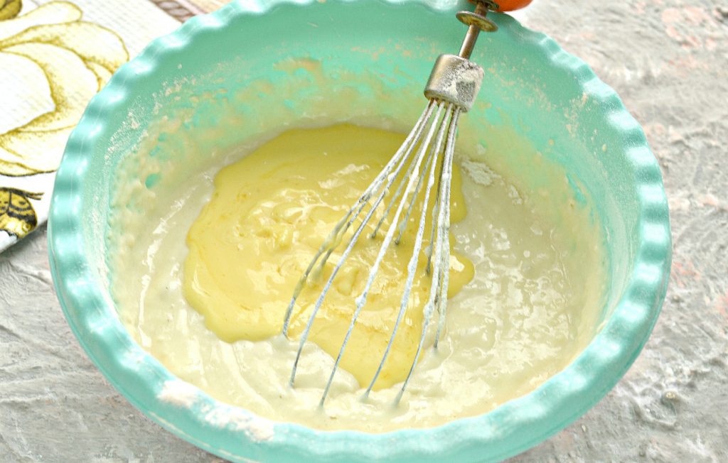 Содержимое миски хорошо перемешиваем. Получаем густое тесто, похожее по консистенции на тесто для оладий.