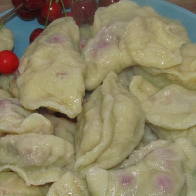 В самом начале лета в саду спеет первая вишня с кисло-сладким вкусом. И первое , что просят мои дети — это вареники. Сочные, сладкие и свежие они привлекают не только семью, но и друзей. Поэтому лепим их большой и дружной компанией. Простое тесто на основе воды и яиц прекрасно подходит к этому блюду.