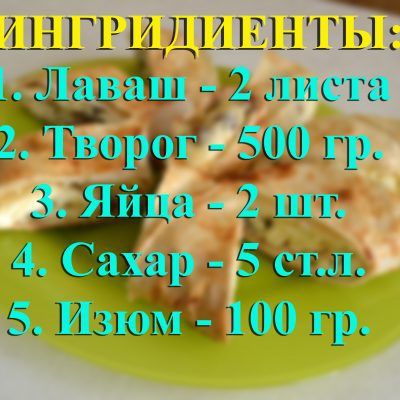 Шаг 1Для приготовления вкусного и хрустящего лаваша с творогом нам необходимо подготовить следующие продукты: лаваш, яйца, сахар, творог и изюм.