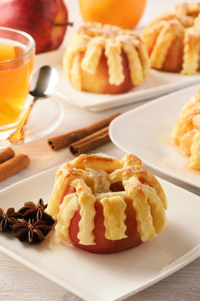 Противень выстелить пергаментом и выложить на него яблоки. Наполнить их медовой начинкой так, чтобы до края остался примерно 1 см. Сверху крест-накрест переплетая уложить полосочки слоеного теста.