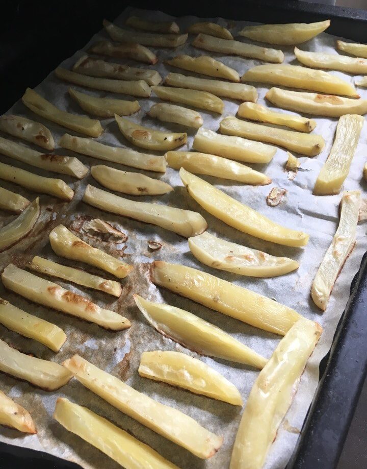 Затем, картофельные бруски выкладываются на пекарскую бумагу в один слой и отправляются в разогретую до 220 градусов духовку примерно на 20 минут. Подавать горячими с соусом или мясом.
