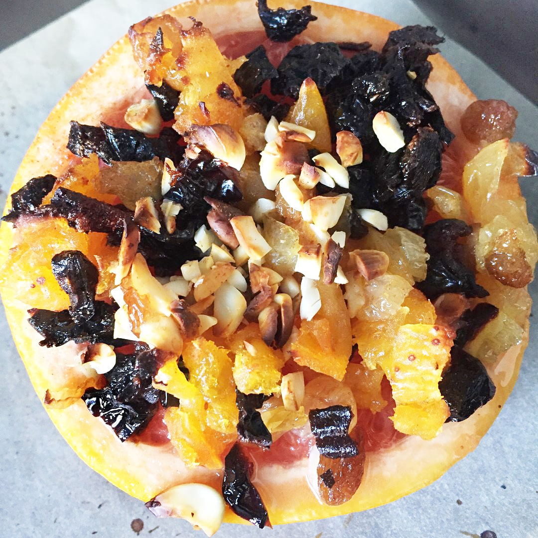 2. С орехов снимаем шелуху. Для этого их можно замочить в горячей воде. Засовываем сухофрукты и орехи в грейпфрут и поверх него.