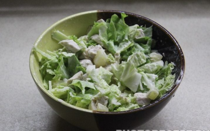 Шаг 1Подготовить все ингредиенты для салата. Слить с ананасов сироп, хорошенько вымыть капусту и салатные листья, предварительно отварить куриную грудинку, а затем полностью остудить.