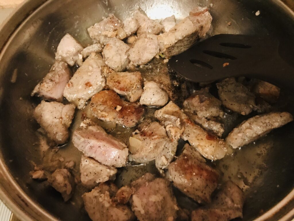 После того, как мясо замариновалось, отправляем его без лука жариться на сковородку.