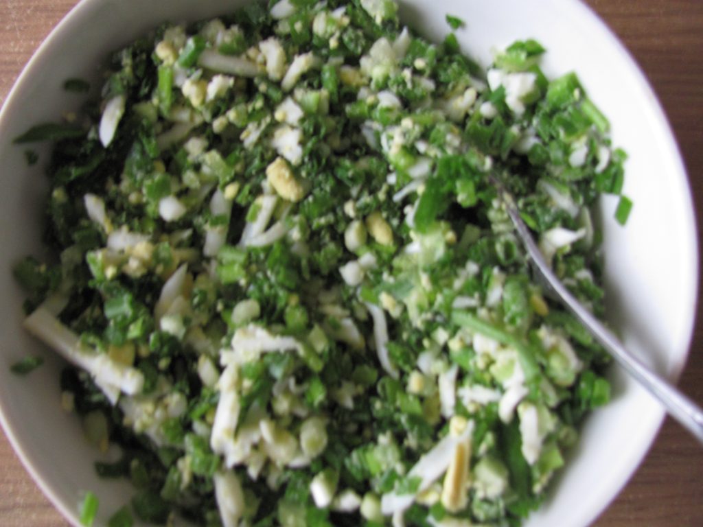 Зеленый лук нашинковать, обмять руками. После этой процедуры начинка не будет столь объемной и ее больше уместится в зразе.
