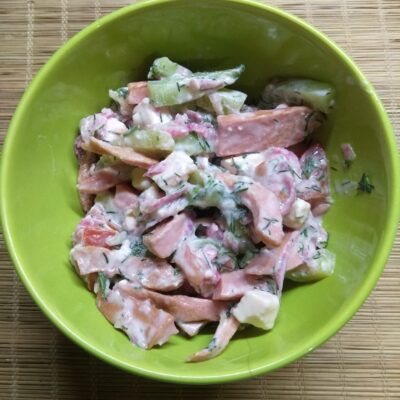 Посмотреть рецепт - Сытный салат с копченой колбасой и сыром
